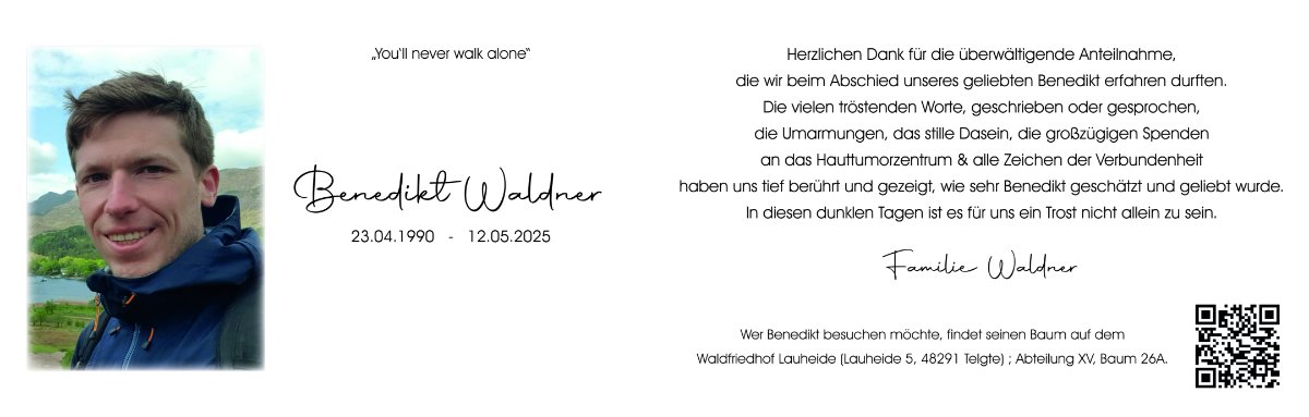 Liebe Familie Waldner, Wir fühlen mit euch mit. Benedikts viel zu früher Tod ist für euch ein schwer zu verkraftender Abschied durch eine unverständliche Krankheit.