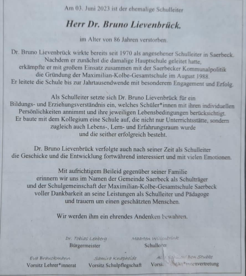 Herrn Lievenbrueck habe ich noch sehr gut als Direktor und als Lehrer im Fach Mathe in Erinnerung, als ich die damalige Hauptschule besucht habe, bevor diese zur Gesamtschule umgewandelt wurde.
