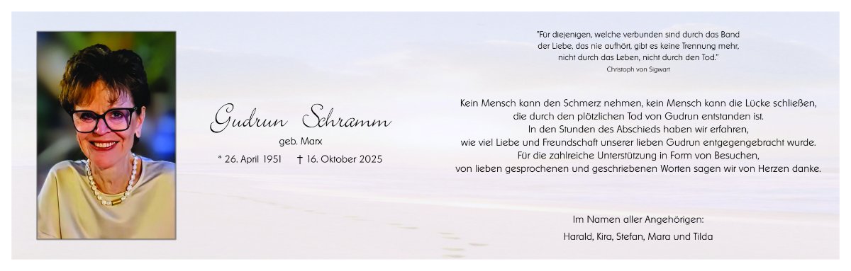 Danke, dass wir dich kennenlernen durften und du unser Leben bereichert hast. So vieles haben wir gemeinsam erlebt, so viele Momente miteinander geteilt.Deine Stimme, dein Lächeln, deine kommunikative Art, deine Fröhlichkeit und Interesse an allem wird uns fehlen.