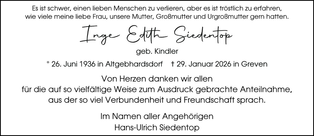 Liebe Petra und Familie Siedentop, mein herzliches Beileid an Dich , Deinen Vater und Deine Familie . Ich kann mich noch gut an Deine Mutter erinnern, an ihre ruhige und freundliche Art, wenn wir uns nach der Schule bei Dir im Zimmer getroffen haben. Lange ist es her unsere Realschulzeit. Wir haben bereits alle die 60 überschritten. Euch alles Gute und viel Kraft. In Anteilnahme Deine ehemalige Klassenkameradin Rosemarie (Rosi)