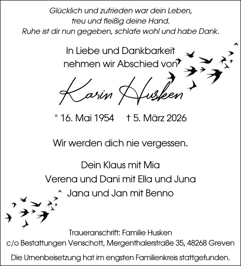 Lieber Klaus, liebe Jana und liebe Verena. Mit dem Tod eines Menschen verliert man vieles, niemals aber die gemeinsam verbrachte Zeit. Die Nachricht von Karins Tod hat uns tief erschüttert. Unser Mitgefühl gehört Dir und Deiner Familie. In stillem Gedenken Bettina und Axel