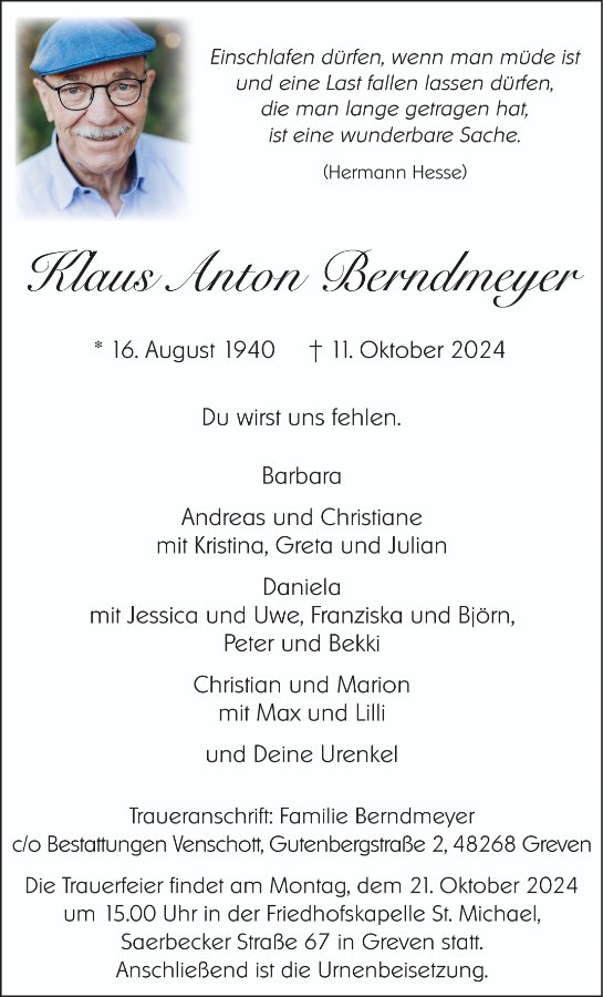 geboren am 16. August 1940 in Vechta gestorben am 11. Oktober 2024 in Warendorf