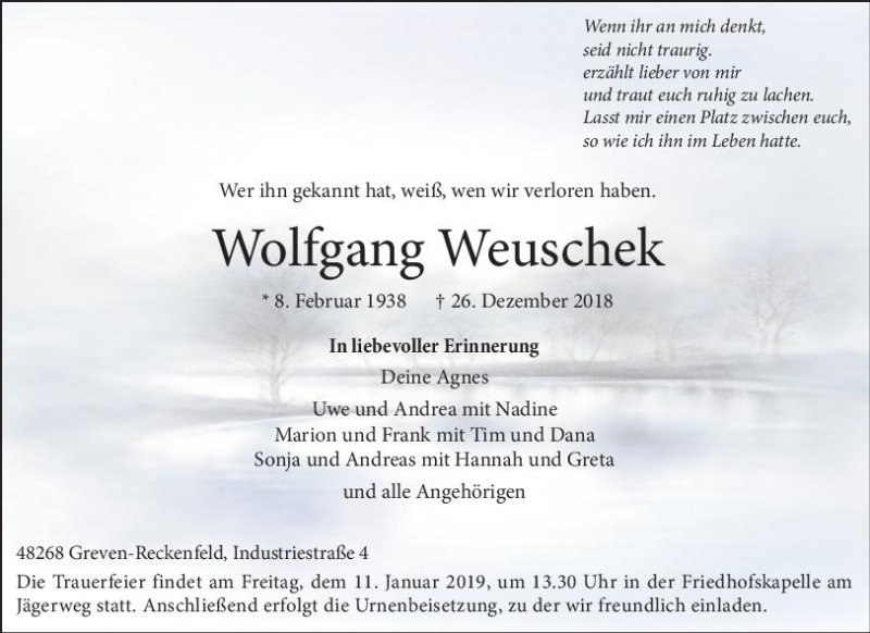 wir wünschen Ihnen von Herzen viel Kraft, dass Sie Menschen um sich haben, die Ihnen in dieser schweren Zeit beistehen und Halt geben. Zusätzlich können Sie auf dieser Gedenkseite Erinnerungen teilen und so das Andenken gemeinsam wachhalten.